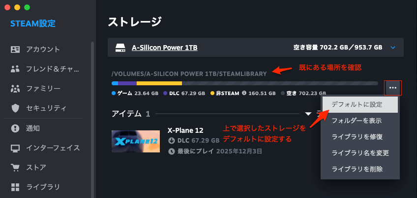 SteamでX-Plane 12のインストール先(ストレージ)を変更するには、Steamクライアントの「ストレージマネージャー」機能を使用します。これにより、すでにインストール済みのファイルを別のドライブへ移動したり、新規インストール時にインストール先を指定したりできます。