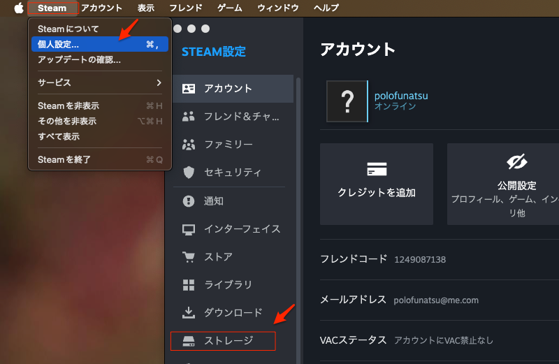 Steamを起動し、左上のメニューから「Steam」-> 「個人設定…」を選択。