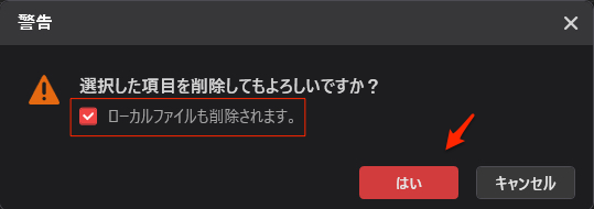 ローカルソースファイルを同時に削除したい場合は、「ローカルファイルも削除する」オプションにチェックを入れること、これで完全にデータを削除できることになる。