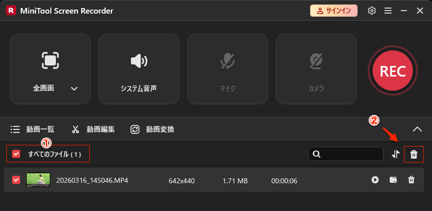 1. 一括処理が必要な場合は、「すべてのファイル」にチェックを入れた後、右側の「削除」アイコンをクリックするだけ。