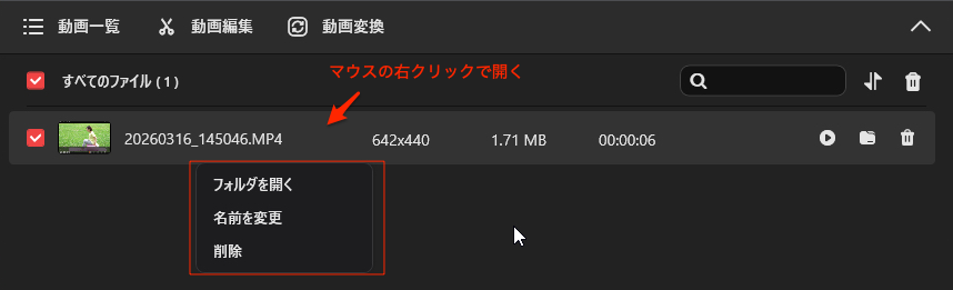 Note:動画項目を右クリックすることで、名前変更、フォルダーへの移動、または完全削除などの操作を素早く行うこともでる。
