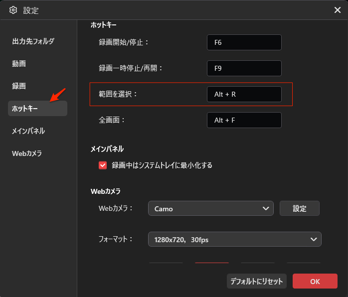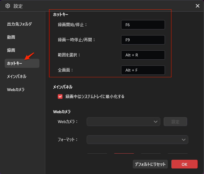 1. ホットキー」セクションでは、録画の開始/停止、一時停止/再開、範囲選択、全画面切り替えのショートカット キーをカスタマイズできる。
