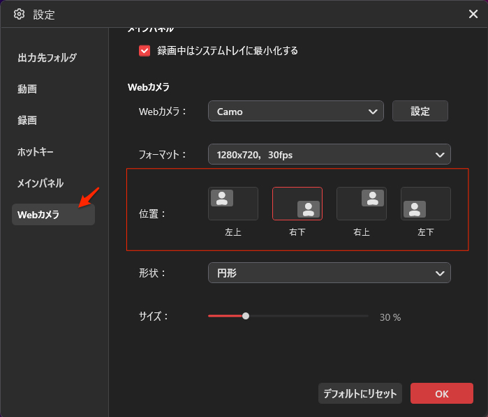 STEP ❷:Webカメラの録画設定を調整する