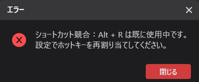 これはショートカットが重複している状態なので、別のショートカットに変更することで解決できる。