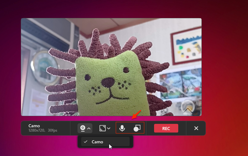 画面録画中に解説者の顔を表示したい場合は、このカメラを有効にして「カメラ」アイコンをクリックするだけで、ピクチャー・イン・ピクチャー録画を有効にすることができるようになる。