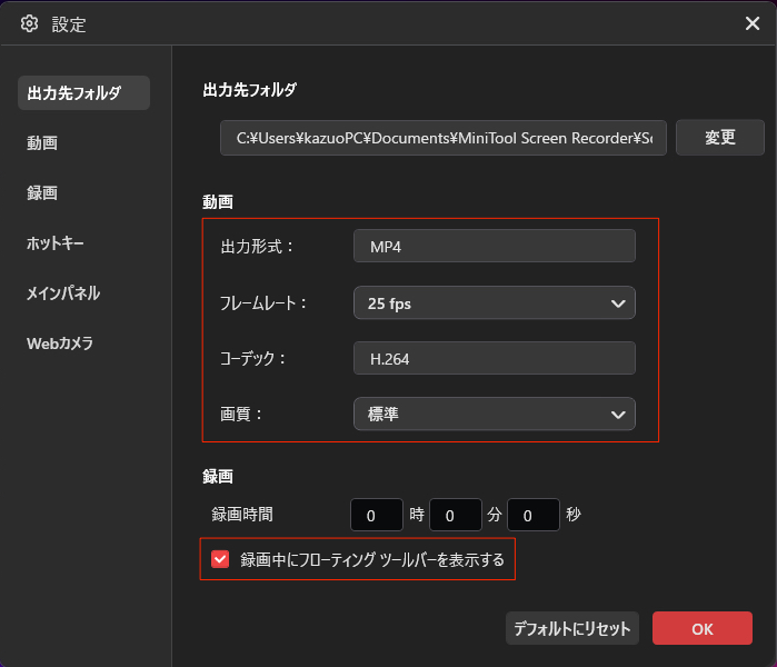 1. 以下の画面のように録画した動画の出力先、フレームレート、画質、および録画時間のプリセットを変更することができる。