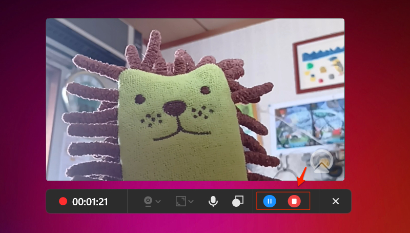 録画中はいつでも、左側「一時停止/再開」ボタンをクリックすることができる。