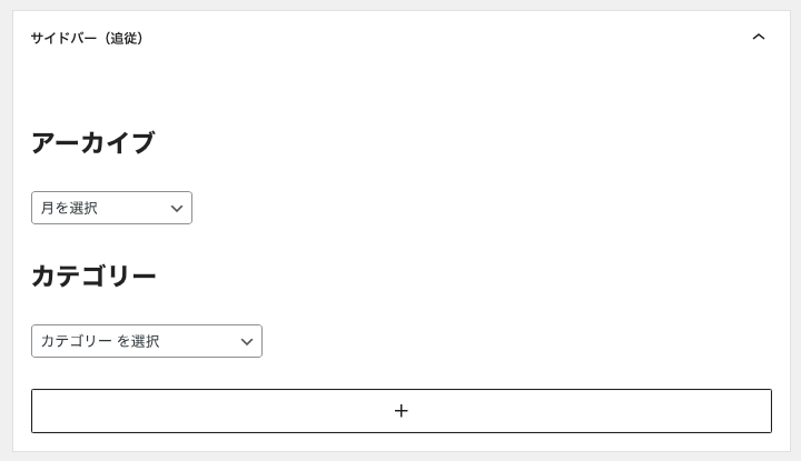 ここでの設定はアーカイブの下(上の画像では「月を選択」となっているところ)に以下のブロックが最初から入っていることになる。
