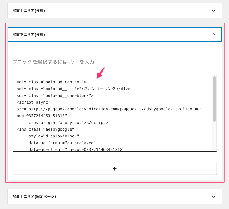 設定箇所は、「外観 -> ウイジェット」から「記事下エリア(固定ページ)」に他の「記事下エリア(投稿)」スポンサーと同じスクリプトが入っている。