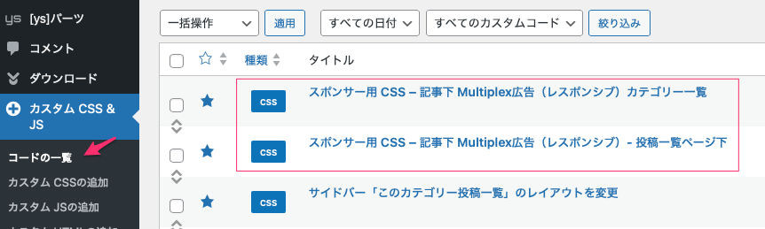 CSSはこの上のところと同じで上の「スポンサー用 CSS – 記事下Multiplex広告(レスポンシブ)カテゴリー一覧」になる。