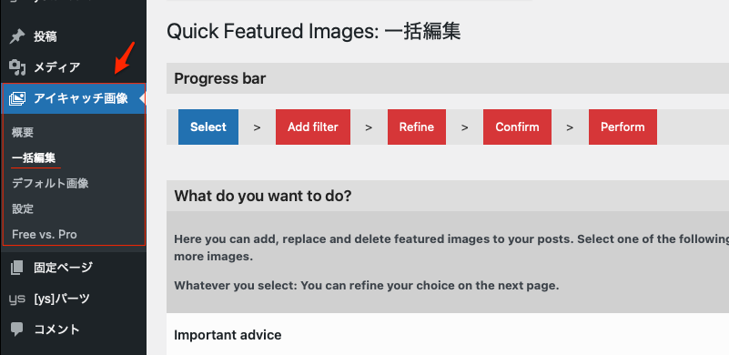 このプラグインは、複数の画像を最初に読み込んで、各ページにイキャッチとしてセットする。