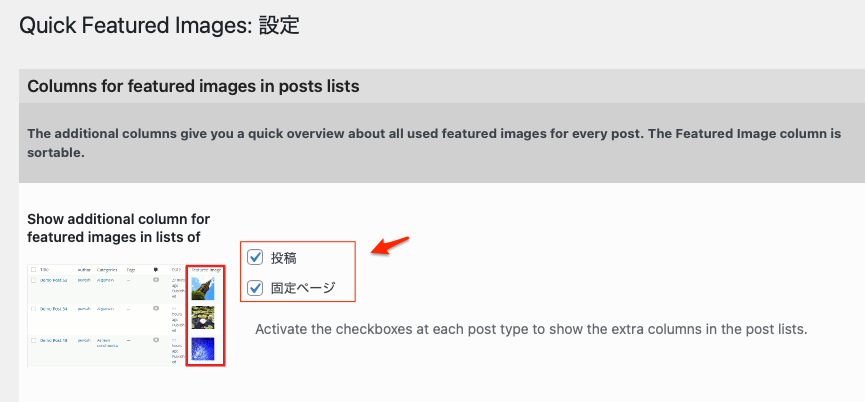 投稿と固定ページの一覧ページにサムネイルを表示するかしないかの設定
