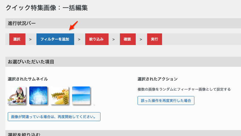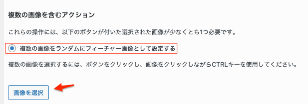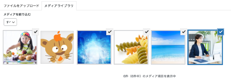 メディアライブラリから又はアップロードで画像を複数選択する。