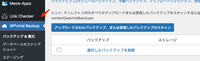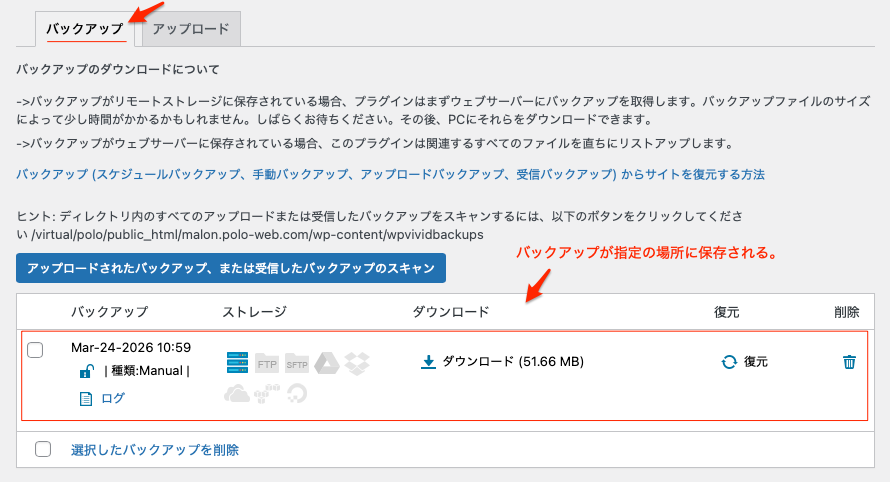 デフォルトの保存先はサイトを設置しているサーバー:/wp-content/wpvividbackups に作成したバックアップが保存される。