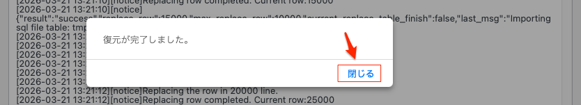 「復元が完了しました」と表示されたら「閉じる」をクリック。