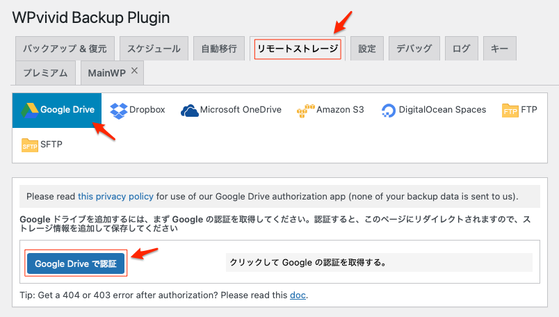 Google Driveを選択。「Google Driveで認証」をクリック。