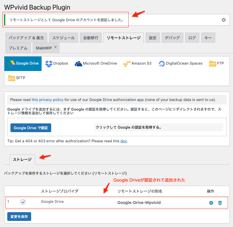 以下のところでバックアップをリモートストレージに送信するを選択するとGoogle Driveにバックアップされるようになる。