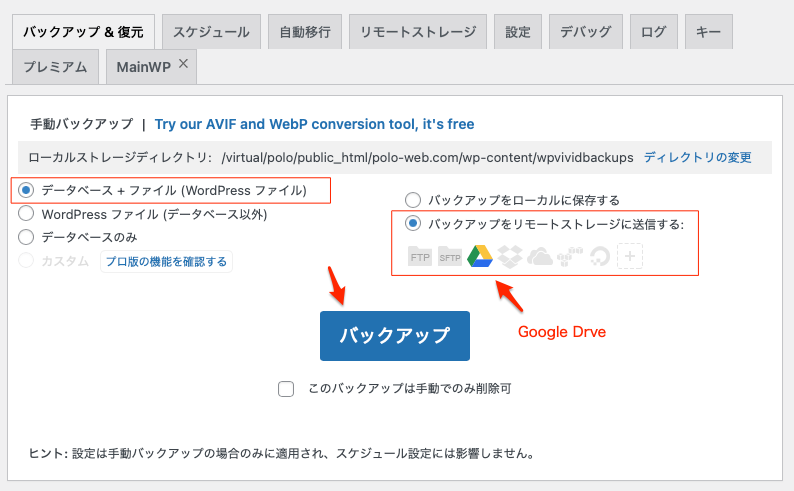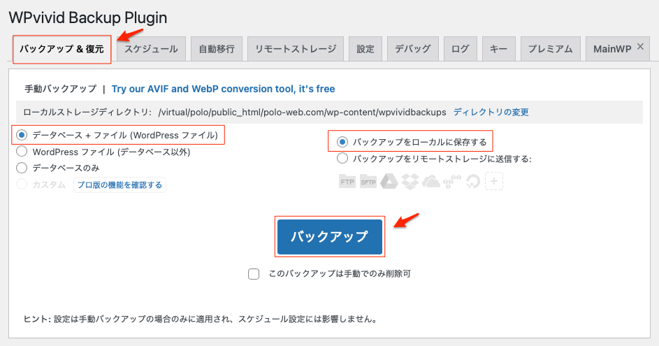 「バックアップ & 復元」タブで「データベース+ファイル(WordPressファイル)」と、「バックアップをローカルに保存する」を指定している。