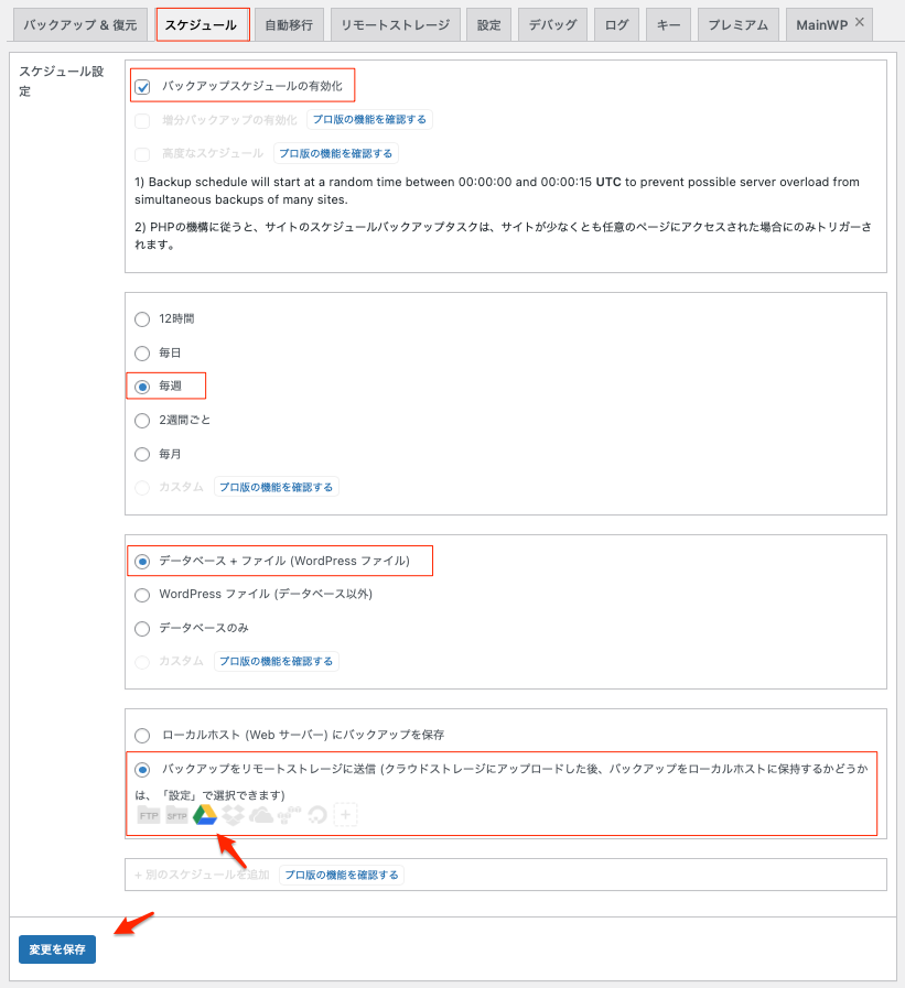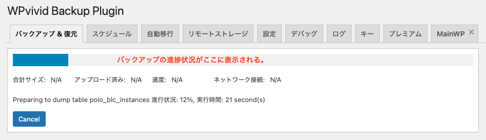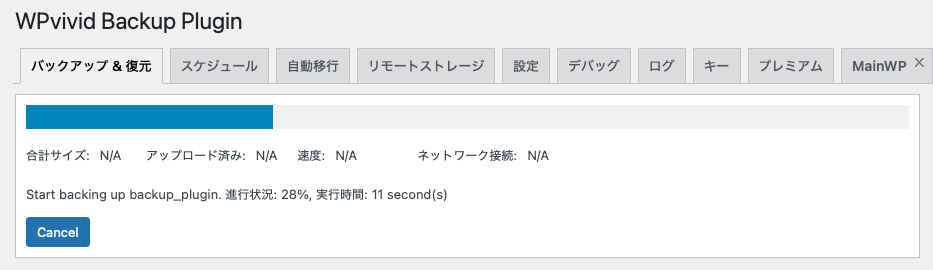 この設定は、メディアライブラリも含む全てのファイルをバックアップするので大きサイトは時間がかかると予想できる。