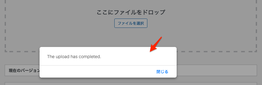 アップロードが完了すると、以下のメッセージが表示れるので「閉じる」をクリック。