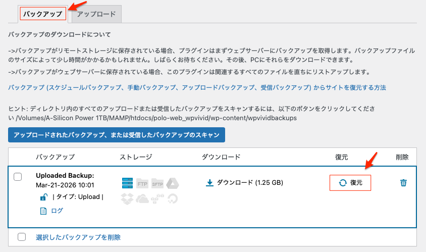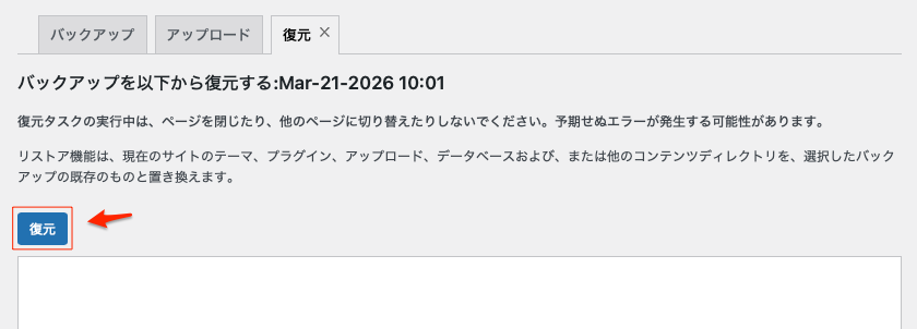 後は、右サイドにある復元をクリックすると、同じサイトに復元することができる。